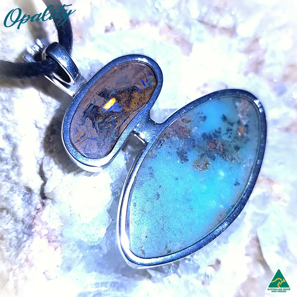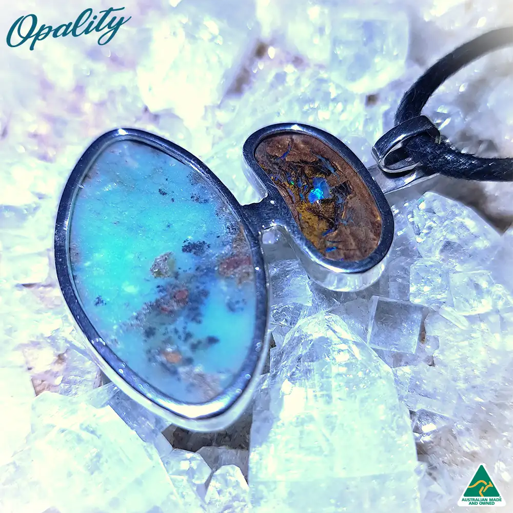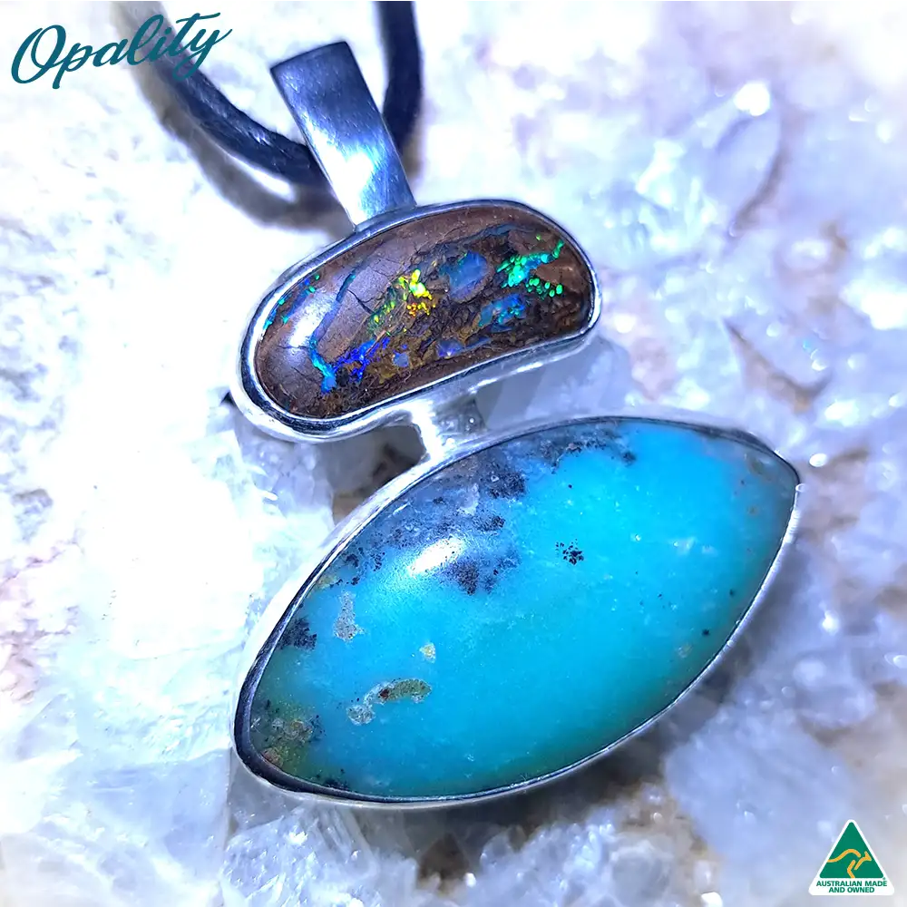 This is a unique, handmade pendant incorporating a natural cut and polished Boulder Opal from Queensland and a natural Chrysoprase set in solid sterling silver and stamped 925 on the back.