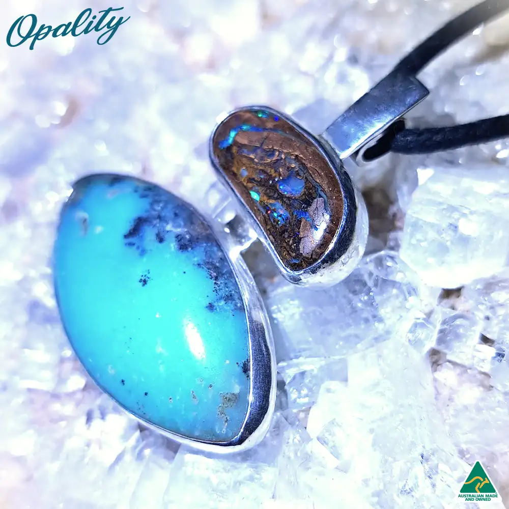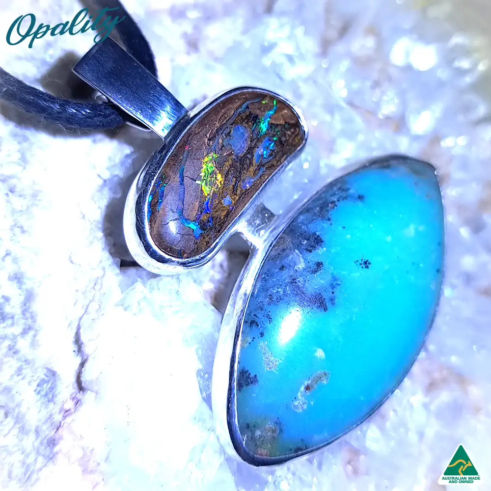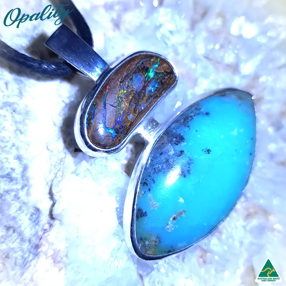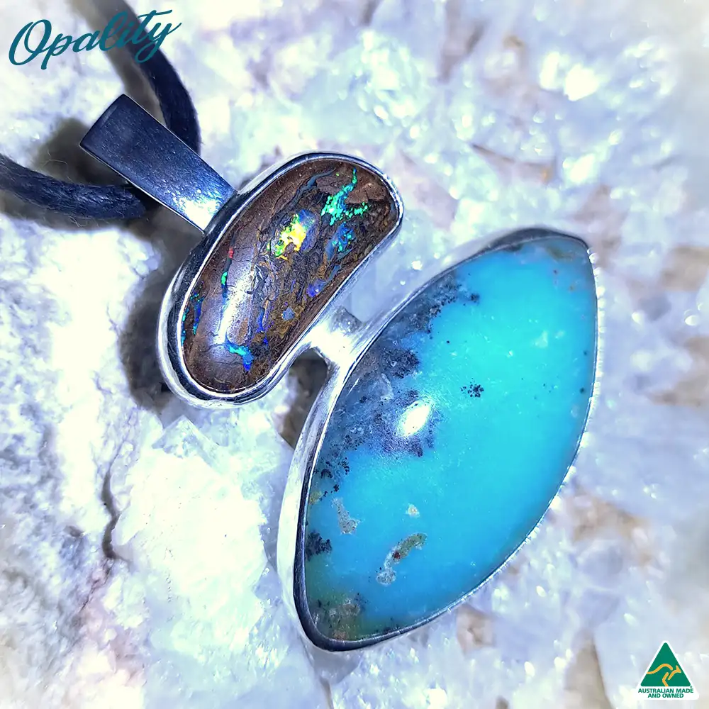This is a unique, handmade pendant incorporating a natural cut and polished Boulder Opal from Queensland and a natural Chrysoprase set in solid sterling silver and stamped 925 on the back.