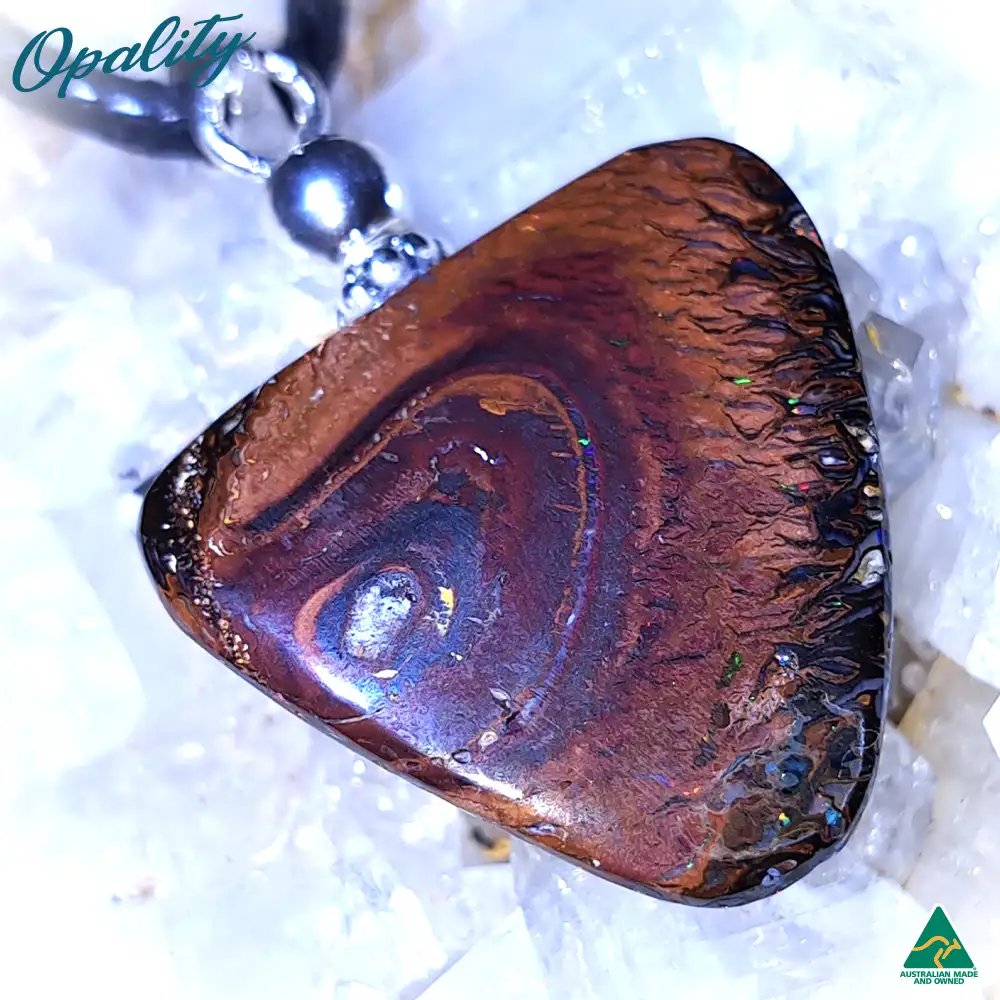The pendant is a freeform triangle shape drilled through the top. It has a dark ironstone base with intricate patterns containing bright flashes of red, orange, yellow, green, blue and purple.
