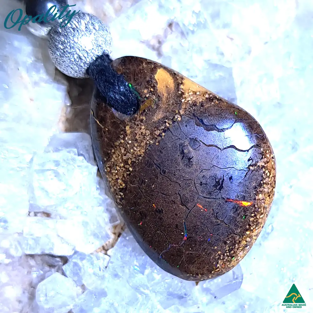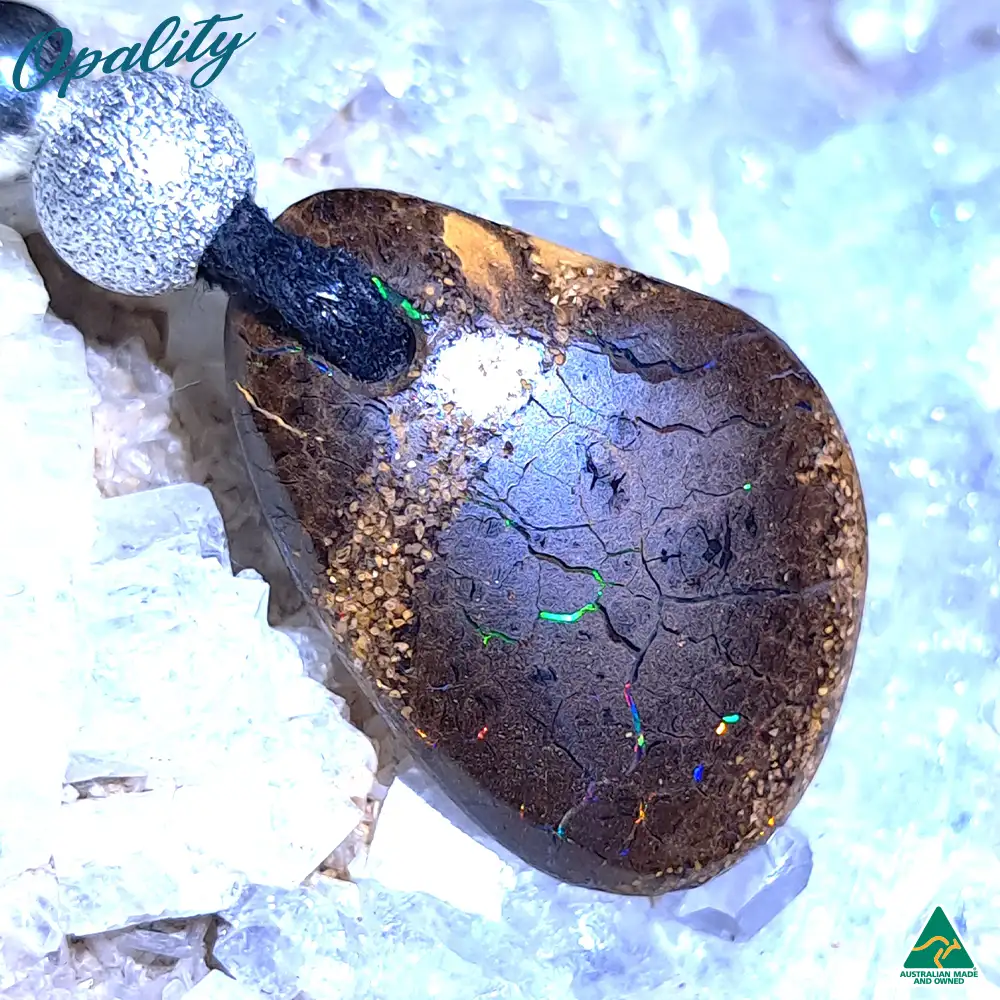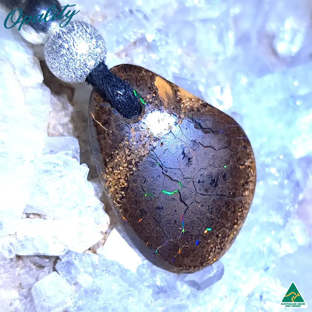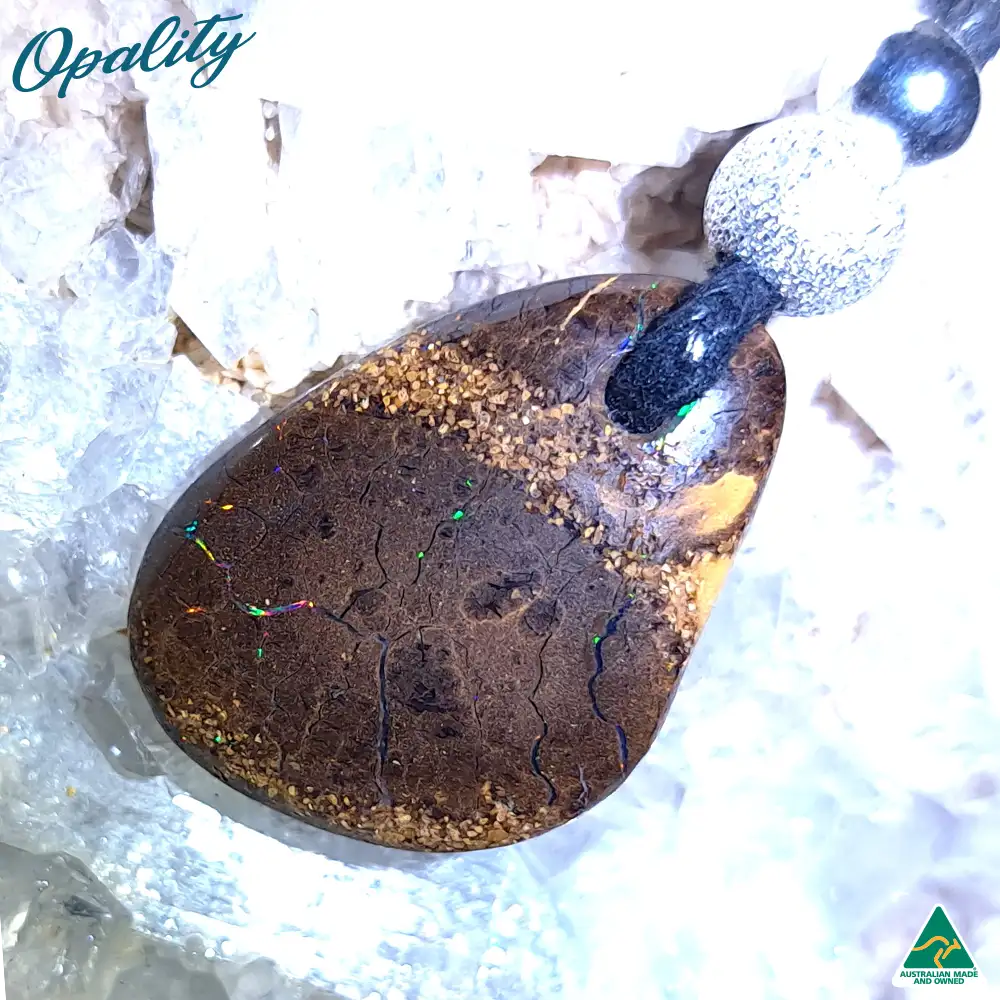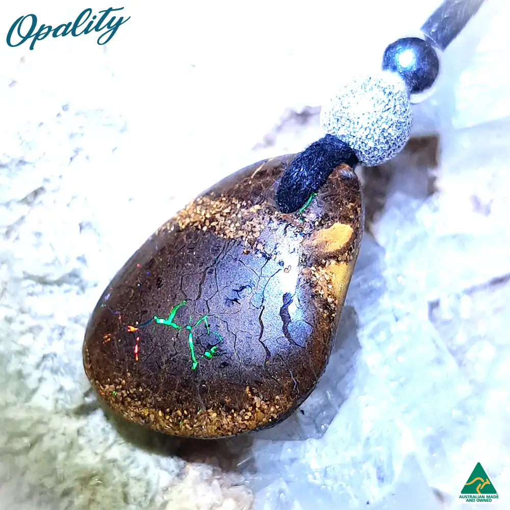 Natural Solid Queensland Boulder Opal Pendant with adjustable waxed cotton cord necklace