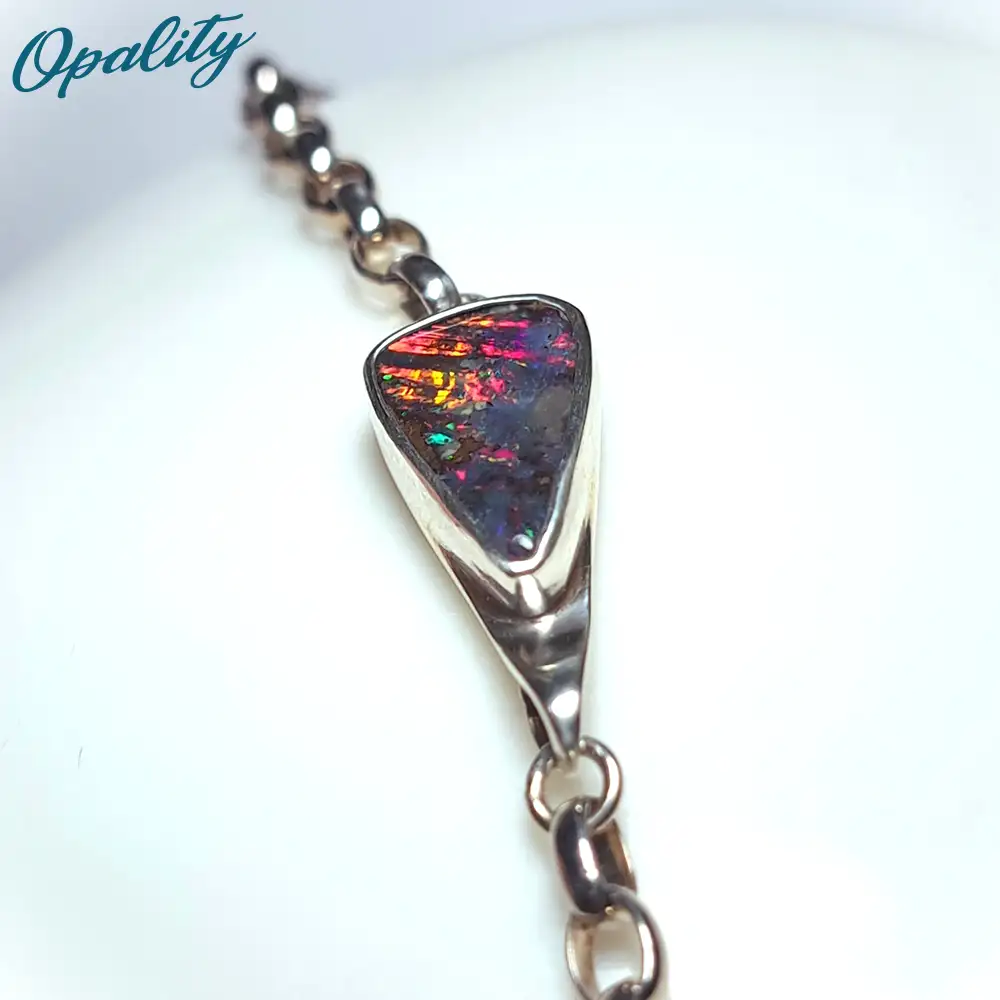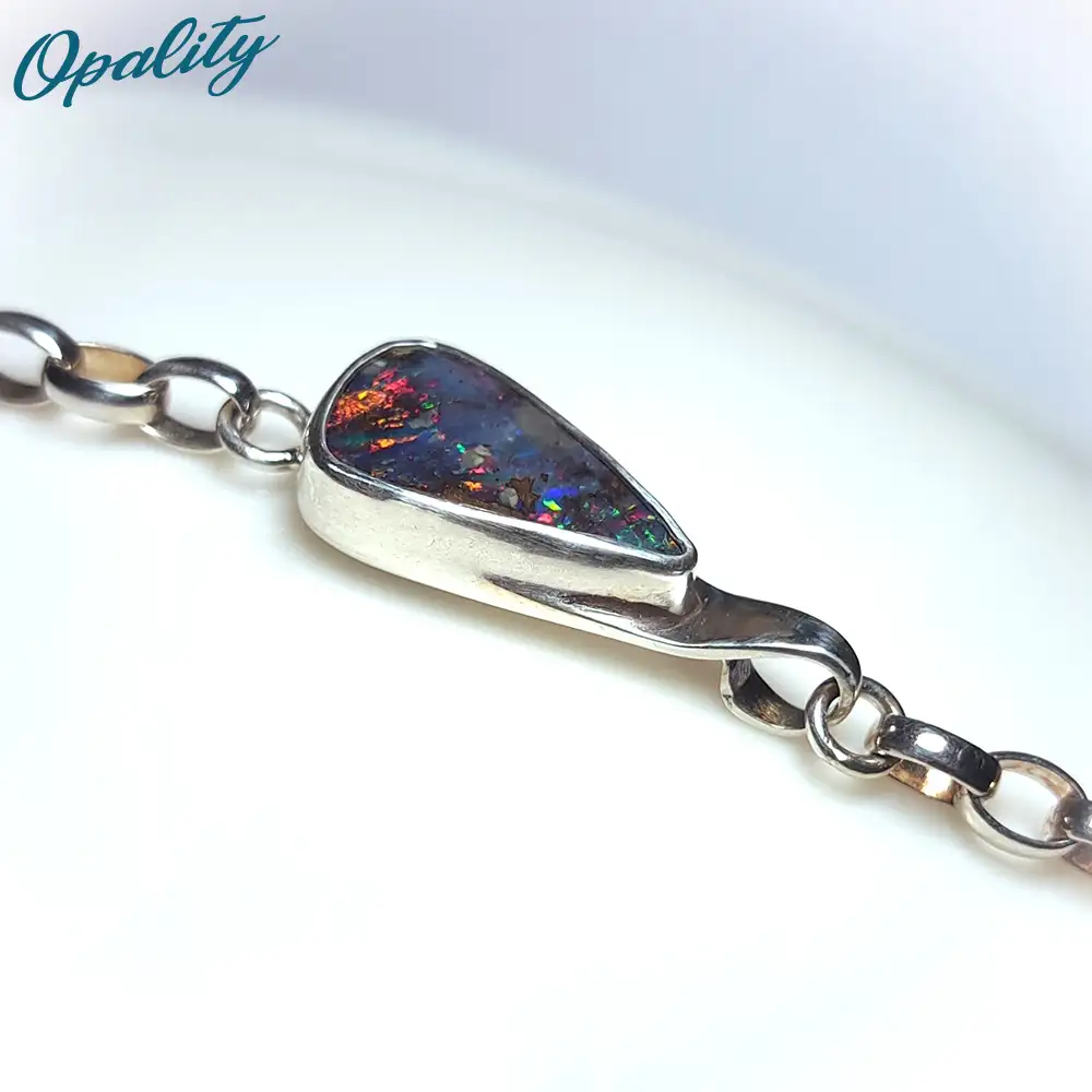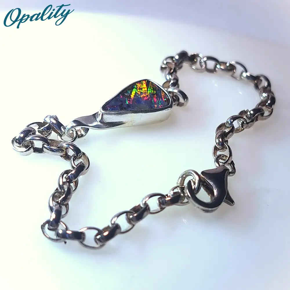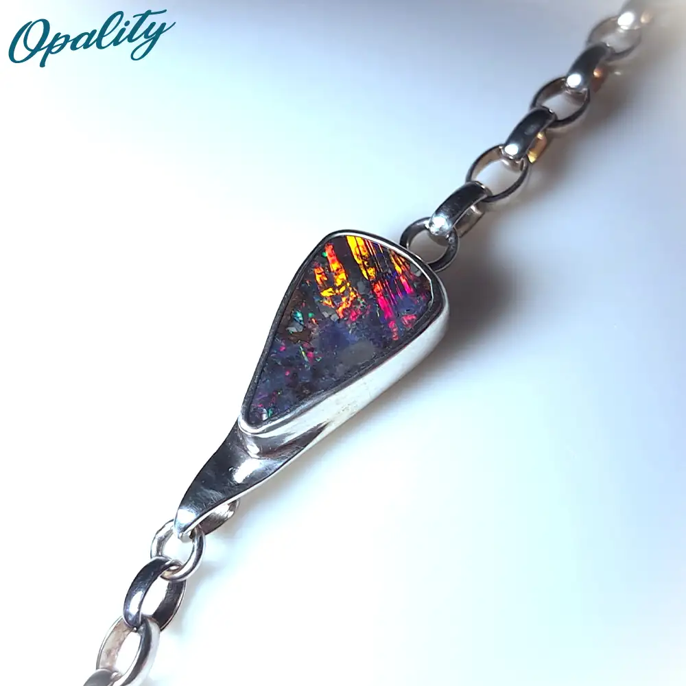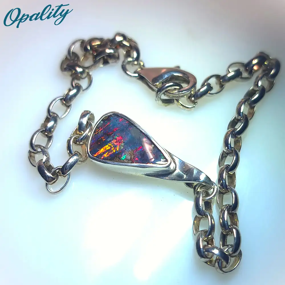 This is a unique, handmade bracelet incorporating a natural cut and polished Winton Opal from Queensland set in solid sterling silver stamped 925 on the back.